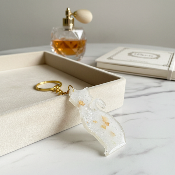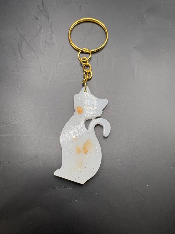 Adorable porte-clé en résine blanche avec de jolis éclats dorés, en forme de chat.