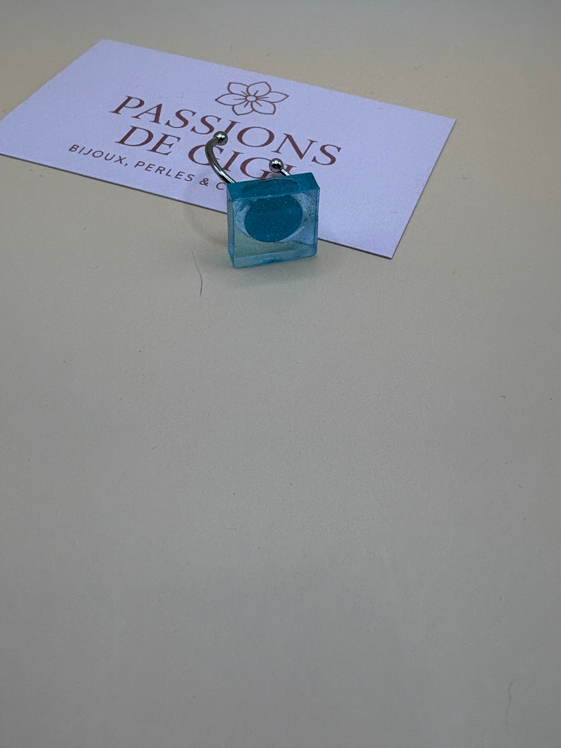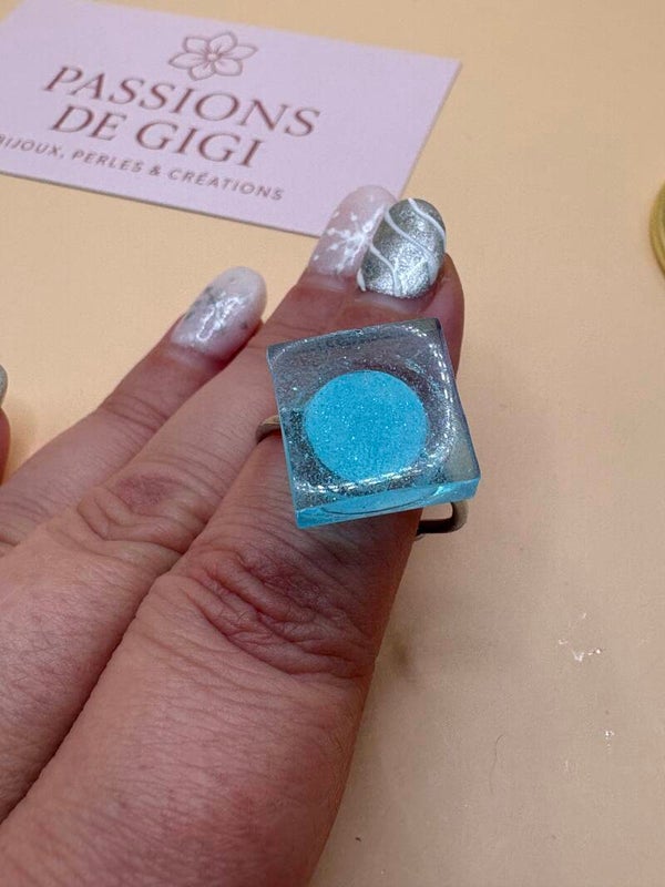 Superbe bague artisanale en résine, avec un plateau carré transparent contenant un cercle turquoise lumineux et de fines paillettes argentées pour un effet brillant et moderne ✨