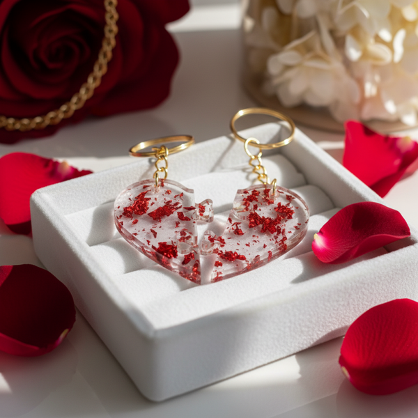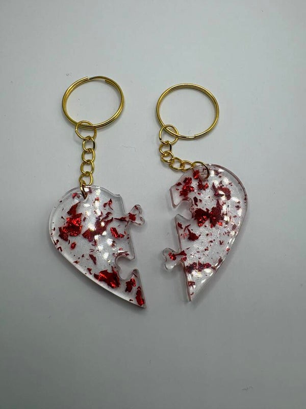 Chaque moitié possède des éclats rouges scintillants, coulés dans une résine transparente et brillante. Une fois réunis, les deux porte-clés forment un cœur complet ❤️