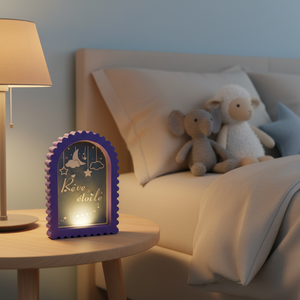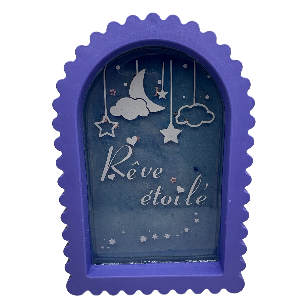 Ajoutez une touche de magie à votre intérieur avec ce charmant cadre violet à effet fenêtre arrondie. Son décor rêveur, agrémenté d’une lune, d’étoiles et de nuages suspendus, crée une ambiance apaisante idéale pour une chambre d’enfant, un coin lecture ou un espace détente.
