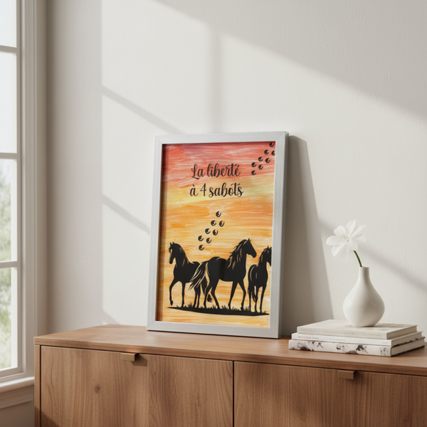 🐎 Apportez une touche de poésie et de nature à votre intérieur avec ce magnifique tableau représentant trois chevaux noirs au coucher de soleil, accompagné de la citation inspirante “La liberté à 4 sabots”. Une pièce unique qui évoque l’esprit sauvage, la puissance et l’élégance du cheval.