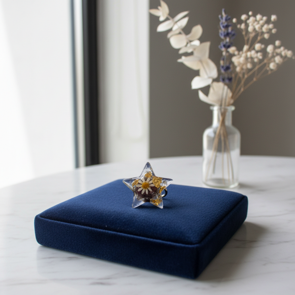 Découvrez cette bague en résine faite main, une pièce unique alliant originalité, nature et délicatesse. Chaque bague est unique.Elle est incrustée avec une fleur séchée, dans une résine transparente, sublimée par de fines feuilles d’or. Son design en forme d’étoile apporte une touche poétique et originale à votre style.