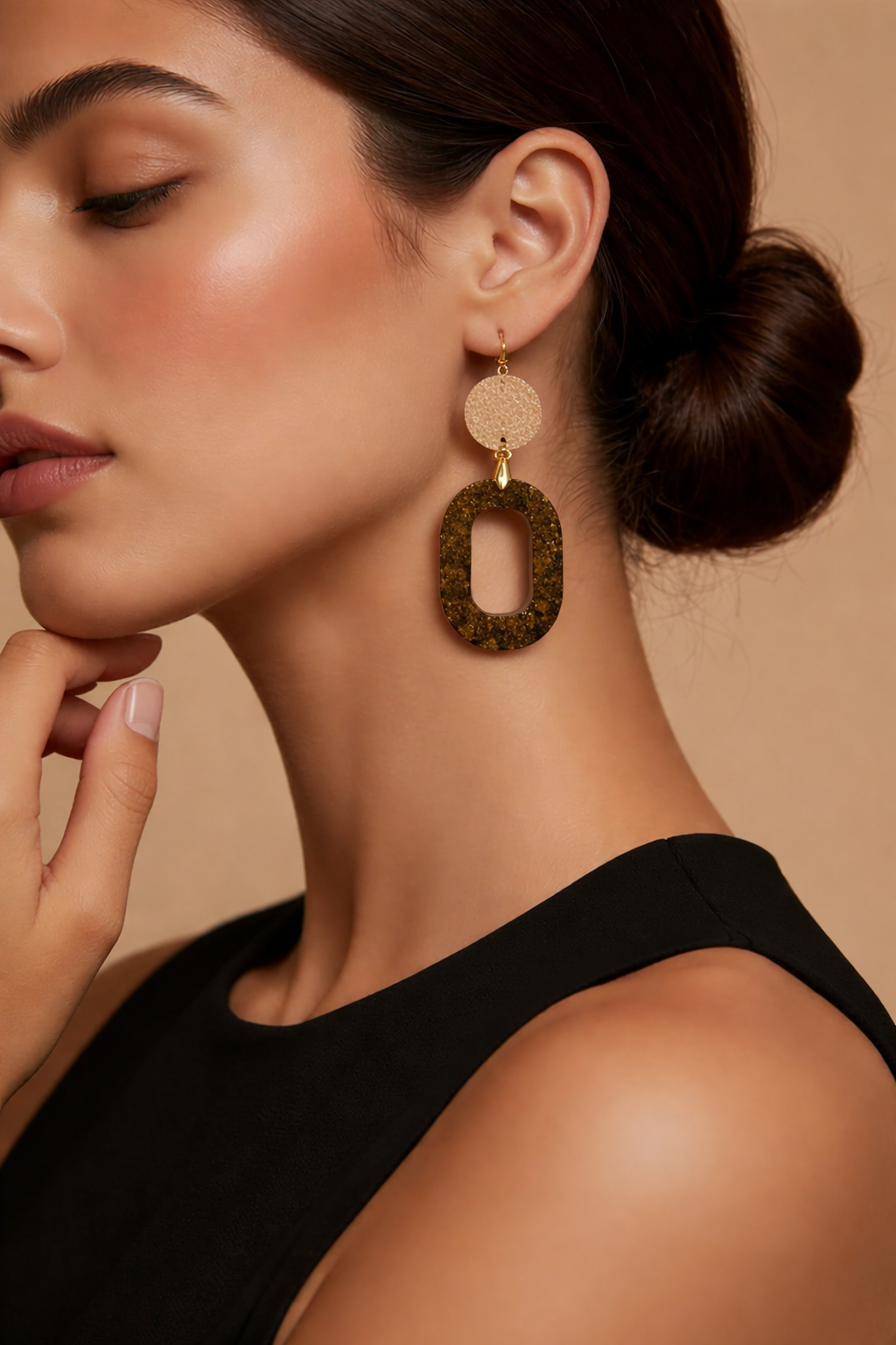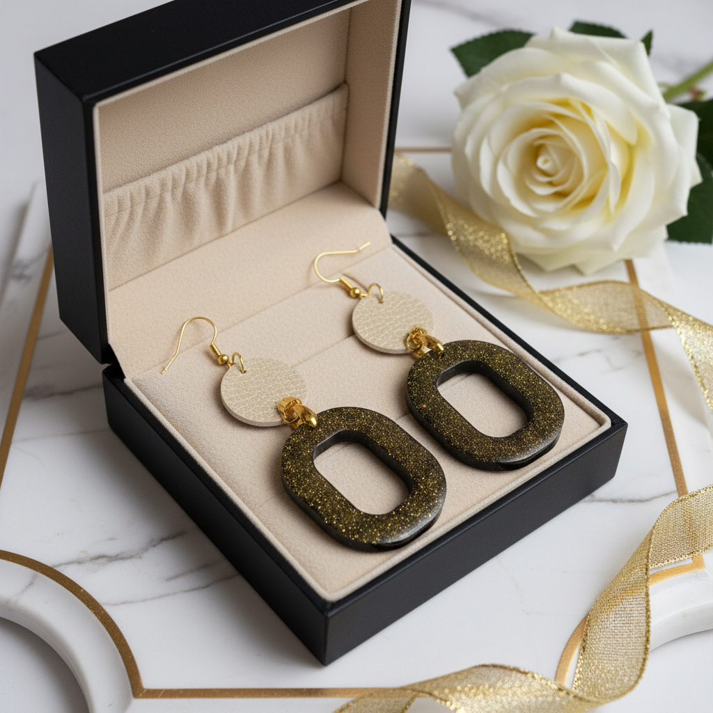Boucles d’oreilles en résine pailletée & simili cuir – Création artisanale élégante -réf 179