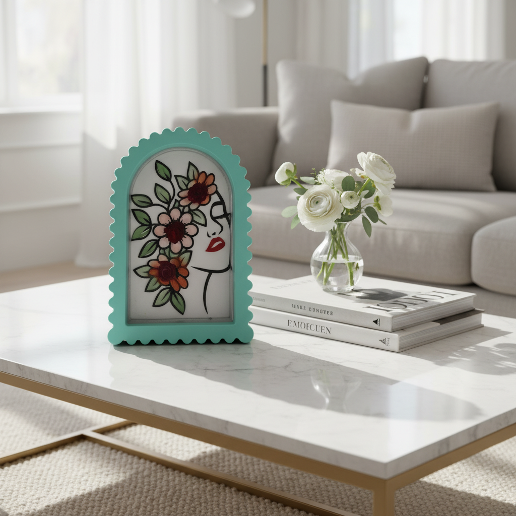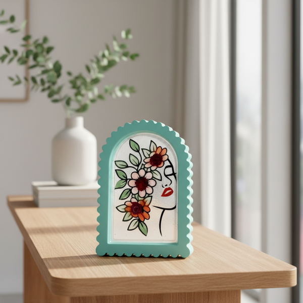 Apportez une touche artistique et poétique à votre intérieur avec ce cadre décoratif en résine, vinyle et fleurs faites main. Cette création originale mêle illustration stylisée de visage féminin et composition florale délicate, pour un rendu moderne et élégant.