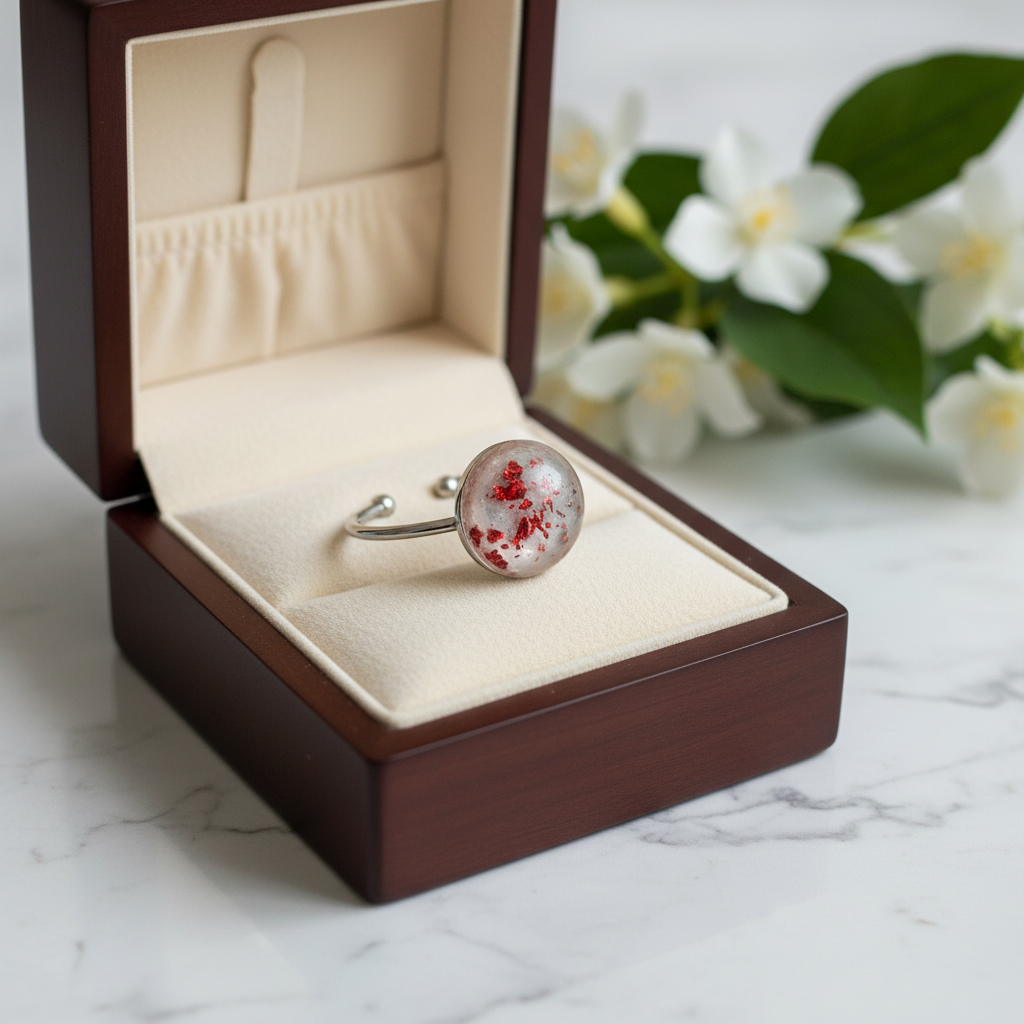 Bague en résine artisanale avec paillettes rouges – Bijou unique fait main - réf 257