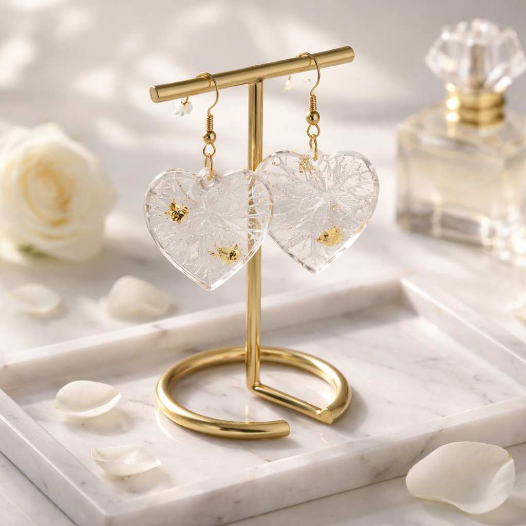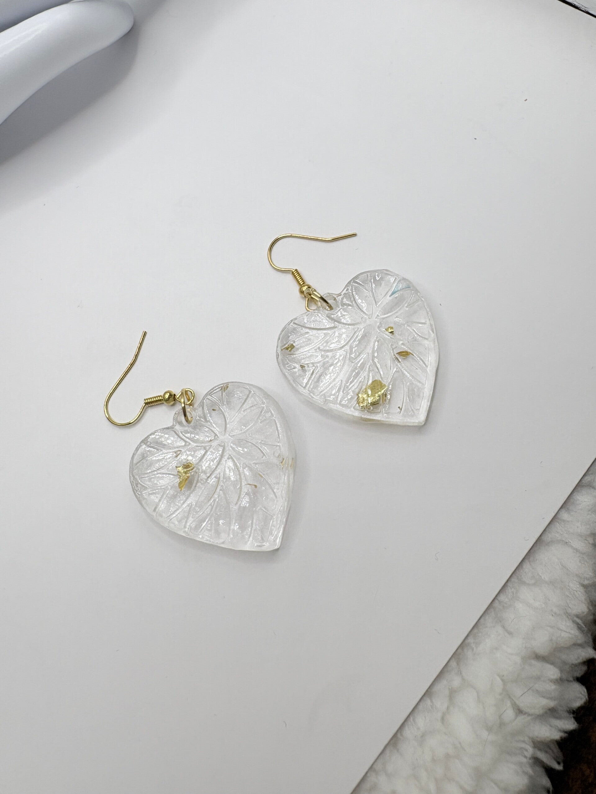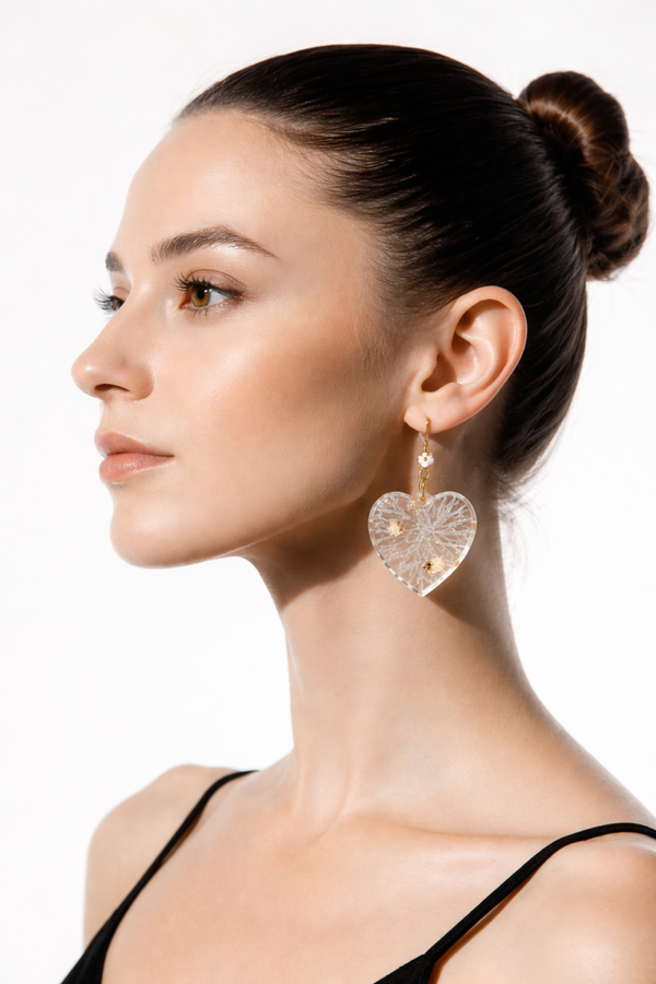 ✨Apportez une touche de délicatesse et d’élégance à votre style avec ces boucles d’oreilles cœur en résine transparente, sublimées par de fins éclats dorés. Leur design délicat, inspiré des nervures de feuilles, capte la lumière avec subtilité pour un rendu à la fois poétique et raffiné. Légères et agréables à porter, elles sont idéales au quotidien comme pour des occasions spéciales.