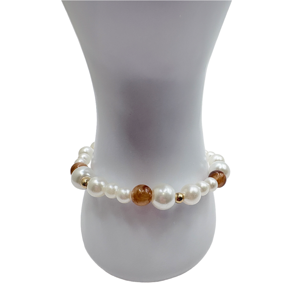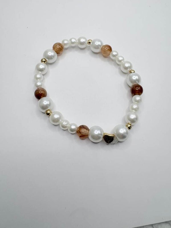 Ce bracelet élastique est composé de perles blanches nacrées, associées à quelques perles marron aux nuances naturelles, ponctuées de petites perles dorées pour une touche lumineuse et raffinée. L’ensemble offre un style doux, chaleureux et intemporel, facile à porter au quotidien.