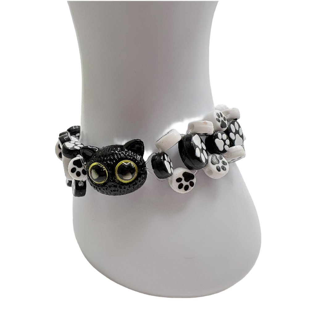 Ce bracelet élastique est composé de perles noires et blanches décorées de motifs pattes, associées à une adorable perle chat noire aux yeux dorés qui apporte une touche ludique et attachante. Son design contrasté noir & blanc en fait un bijou original, parfait pour les amoureux des chats et des animaux.