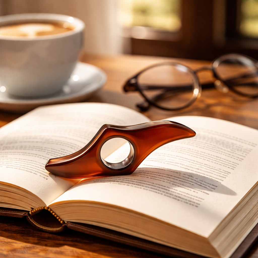Elle se glisse autour du pouce et maintient les pages écartées, offrant un confort de lecture optimal, à la maison comme en déplacement.