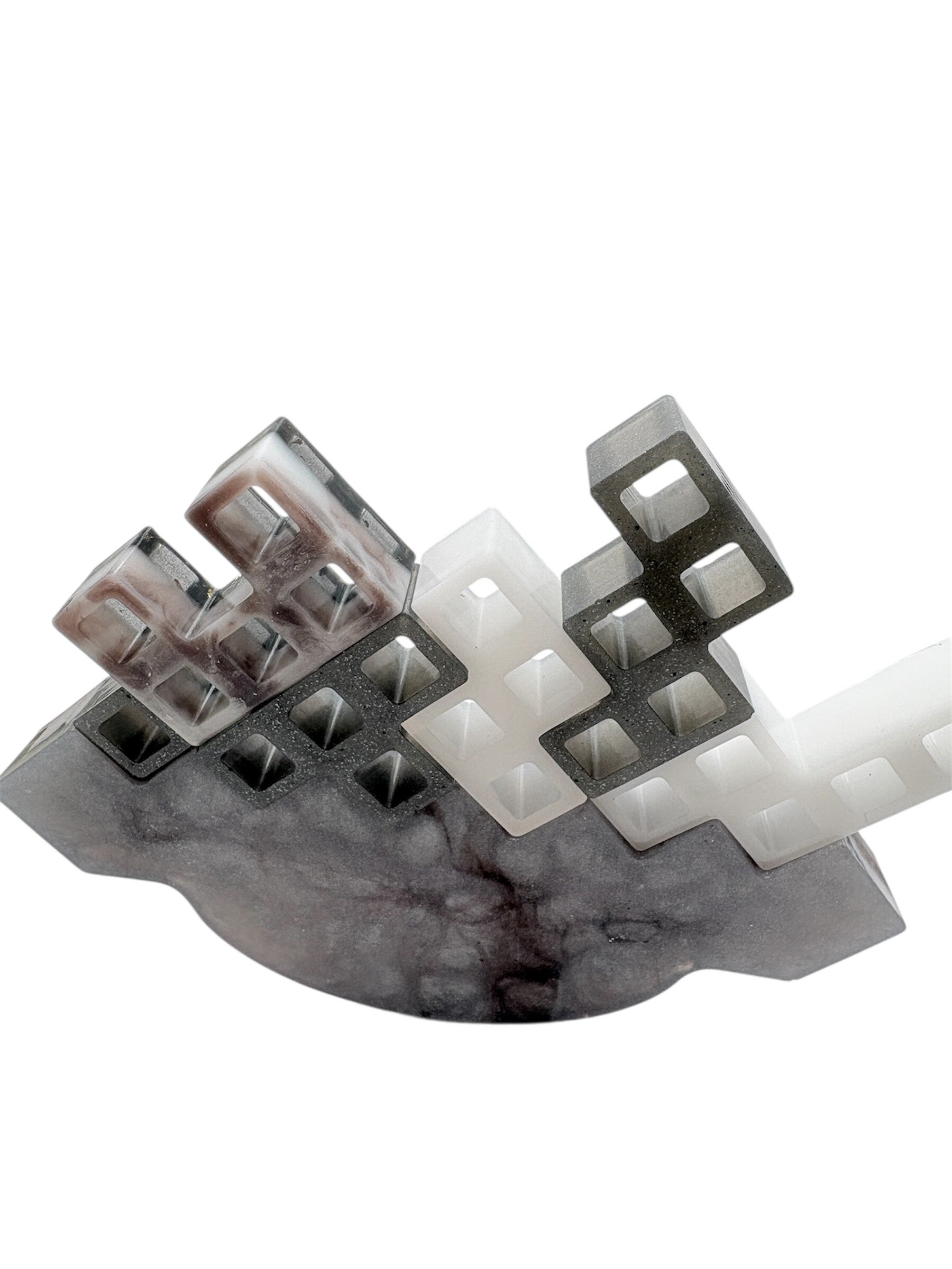 Support décoratif en résine artisanale, au design géométrique moderne. Élégant et original, il accueille de petits éléments cubiques en résine pour une décoration unique et contemporaine.