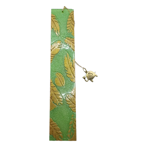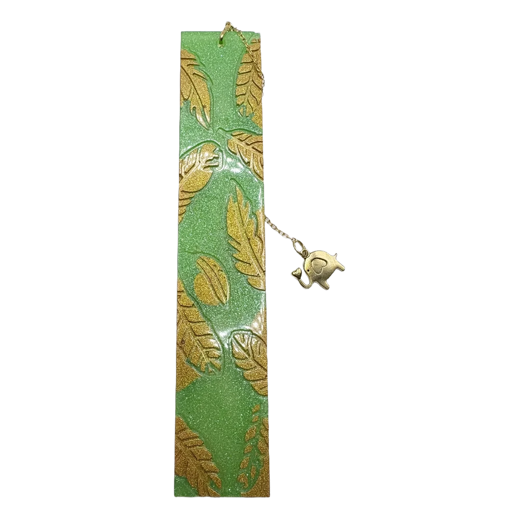 Ce marque-page est réalisé à la main en résine vert lumineux, subtilement pailletée, mettant en valeur de délicats motifs de feuilles dorées inspirés de la nature.