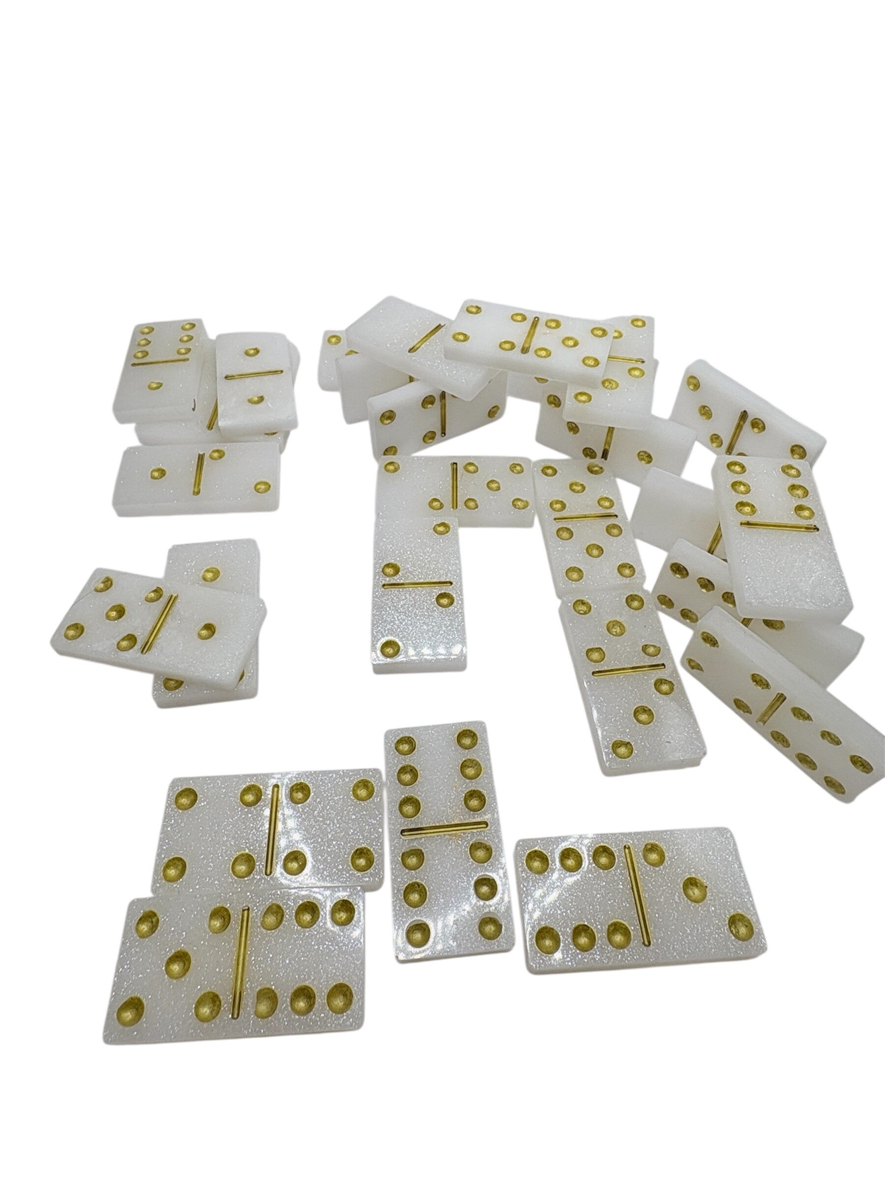 Jeu de dominos au design élégant, composé de pièces rectangulaires blanches à finition nacrée, avec marquages et séparations dorés.