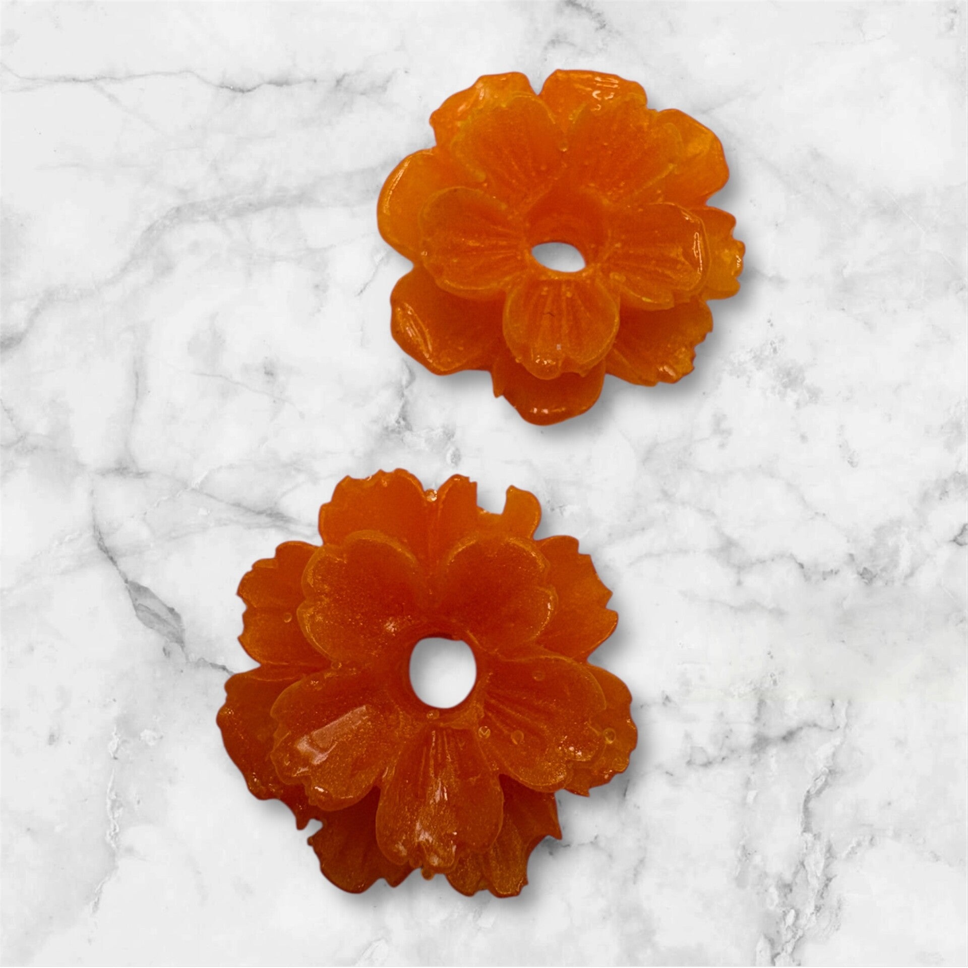 Paire de pampilles décoratives en forme de fleur, coloris orange avec un bel effet lumineux.