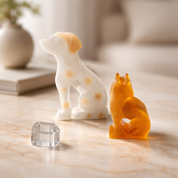 🐶🐱 Apportez une touche de tendresse et d’élégance à votre intérieur avec cette sculpture décorative représentant un chien et un chat. Réalisée en verre artisanal, cette création joue sur la transparence, les textures satinées et les teintes chaleureuses ambrées et ivoire.