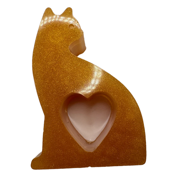 Le chat, délicatement intégré au chien, arbore un petit cœur symbolisant l’amour et la complicité entre ces deux compagnons emblématiques.