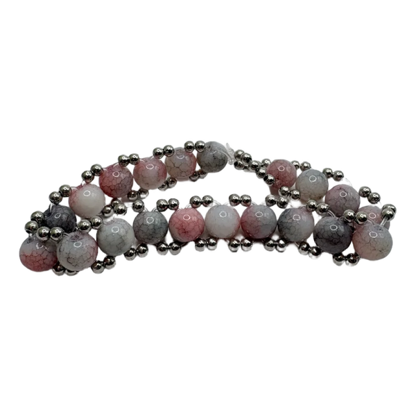 Ce bracelet élastique se distingue par son élégant assemblage de perles aux nuances douces de rose, gris et blanc marbré. Les perles rondes sont subtilement séparées par de petites perles argentées, apportant brillance et équilibre à l’ensemble. Son design à plusieurs rangs donne un effet volume raffiné tout en restant délicat. Confortable et facile à porter, il s’adapte parfaitement au poignet.